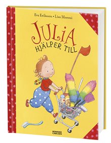 Julia är bra på att hjälpa till. Allt blir så fint – Julia också! Eva Eriksson och Lisa Moroni har skapat en serie varma och mysiga småbarnsböcker om charmtrollet "Julia". Rolig och lekfull läsning för tvååringar och deras familjer. Julia och mamma har mycket att göra för i kväll ska mammas kompisar komma på middag. Först ska de handla och när de kommer hem ska mamma baka paj. Julia bakar småkakor. Oj, vad mycket mjöl det blev överallt! Men det gör inget. Julia hjälper till. Tur att hon har sin nya dammvippa. Damma, damma. Hela huset blir så fint. Strax börjar kalaset. Julia hjälper mamma med läppstiftet. Då ringer det på dörren. Mamma öppnar. Snart är Julia också klar, hon ska bara ... Måla, måla.