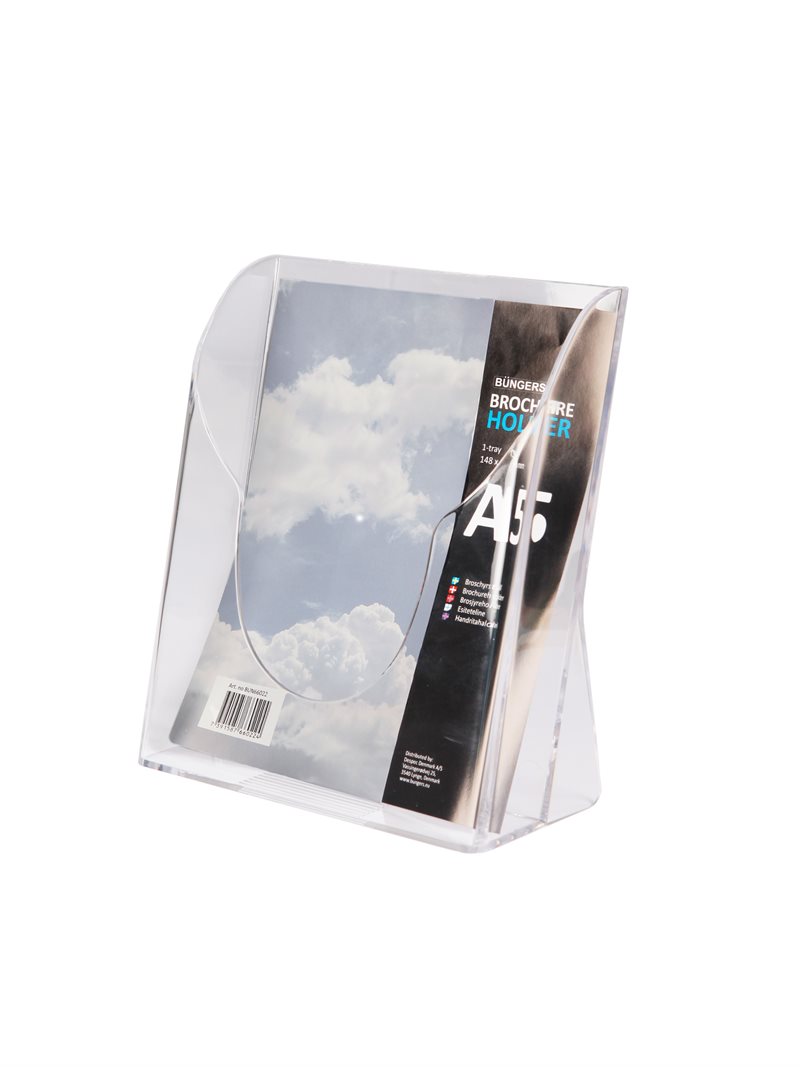 Broschyrställ för exponering av flyers, broschyrer, tidskrifter med mera. För disk eller väggmontering. Tillverkade av glasklar polystyren. Mått: H 197mm B:165mm D: 85mm, mått insida B:156mm D: 43mm