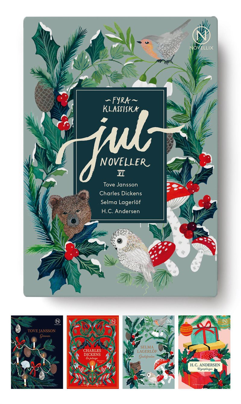 Frosten glittrar på träden och snön knastrar under fötterna, decembermörkret sänker sig allt tidigare och luften är klar och kall. Utomhus lyser stjärnhimlen, inomhus tänder vi ljus för att värja oss mot natten. Det har blivit jul – en tid genomsyrad av kärlek, traditioner och magi. Denna ask är fylld med fyra noveller och all julmagi man kan önska sig. Här har du värmande klassiker att ta med dig upp i soffan, så tänd ett ljus och följ med in i den magiska julstämningen.
